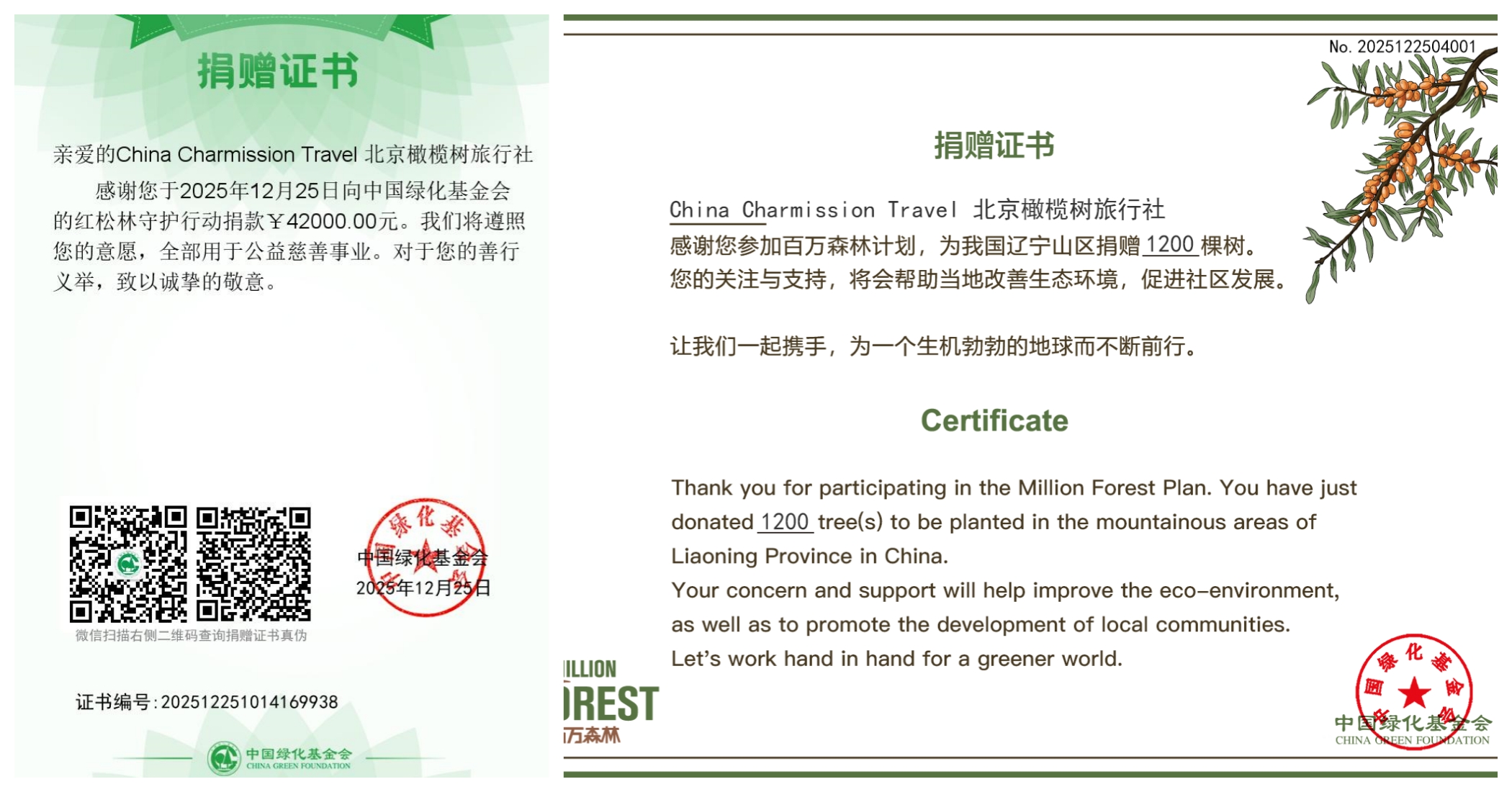 Recently, Charmission Travel donated 42,000 yuan to the "Korean Pine Forest Protection Initiative" launched by the China Green Foundation. The donation is earmarked for the ecological restoration of Korean pine forests and the development of sustainable forestry economy in the eastern Liaoning mountainous area.