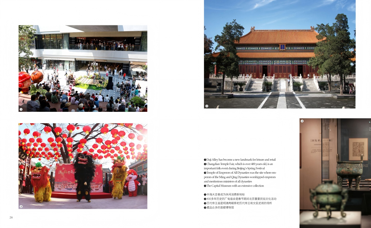 Culture covers theaters, museums, and intangible cultural heritage events, such as Huguang Guild Hall, the Capital Museum, and the 400-year-old Changdian Temple Fair.