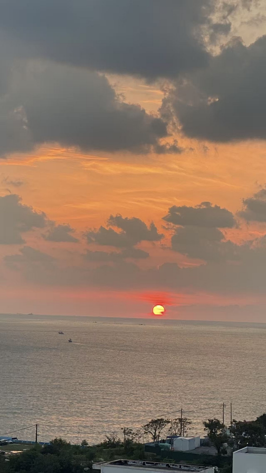 In the evening, we watched the sunset over the sea. We saw the golden fireball slowly sink below the horizon, igniting both the sky and the sea, dyeing them a splendid golden-red. The clouds were like crumbled warm jade, covering the entire sky.